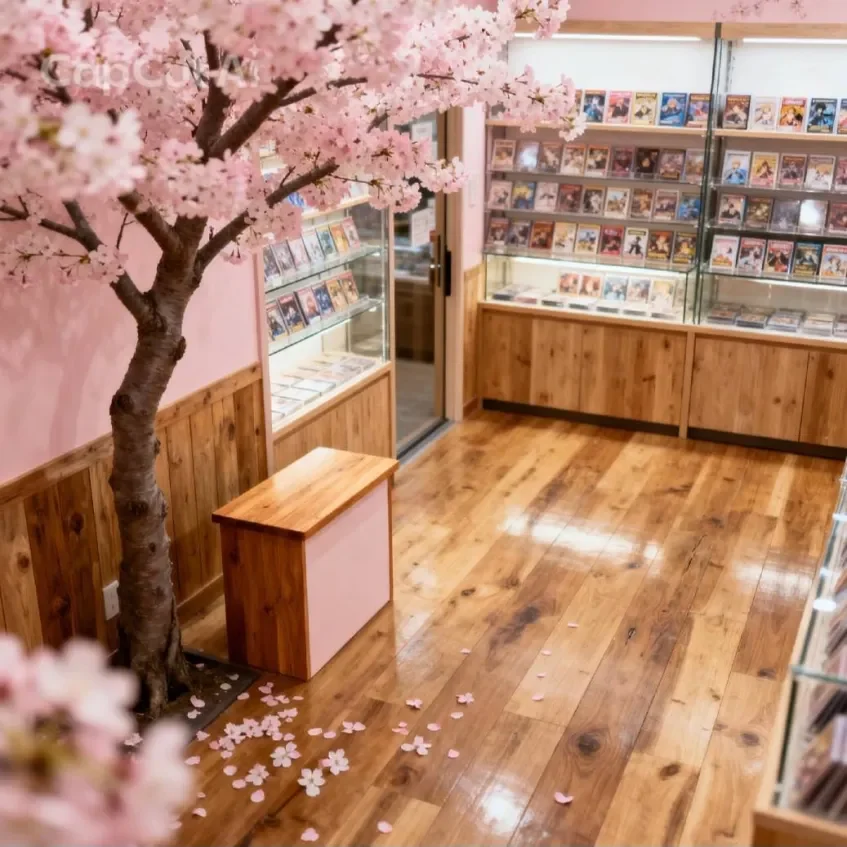 Unser Laden besticht durch ein liebevoll gestaltetes asiatisches Design, mit einem zentralen Kirschblütenbaum, der eine gemütliche Atmosphäre schafft. Hier findest du exklusive Karten und Merchandise, die jeden Sammler und Fan begeistern.